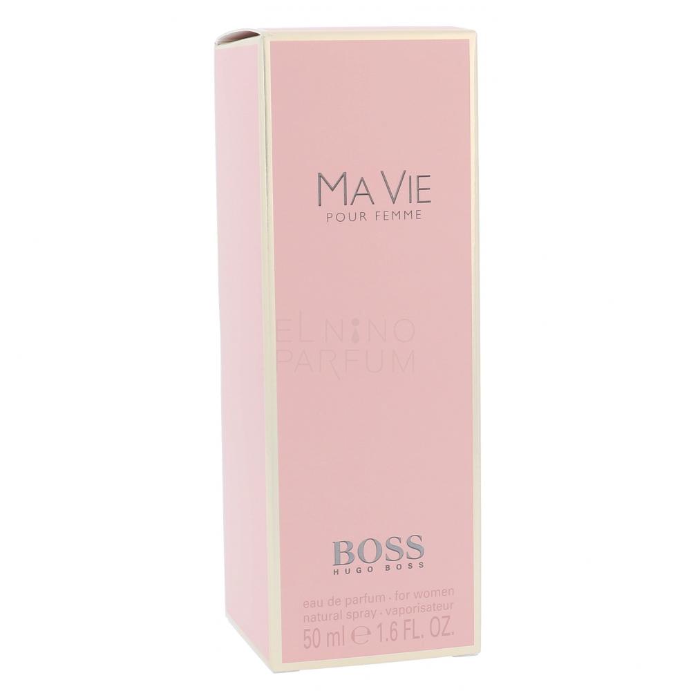 Tak jak zapach Hugo Boss Boss Ma Vie Pour Femme jest delikatny i niewinny, podobny charakter ma opakowanie tych perfum. Flakon o niezwykle smukłych proporcjach ma subtelną różową farbę, która doskonale komponuje się ze złotawym akcentem opaski biegnącej dookoła obwodu flakonu na wysokości tuż pod rozpylaczem.
