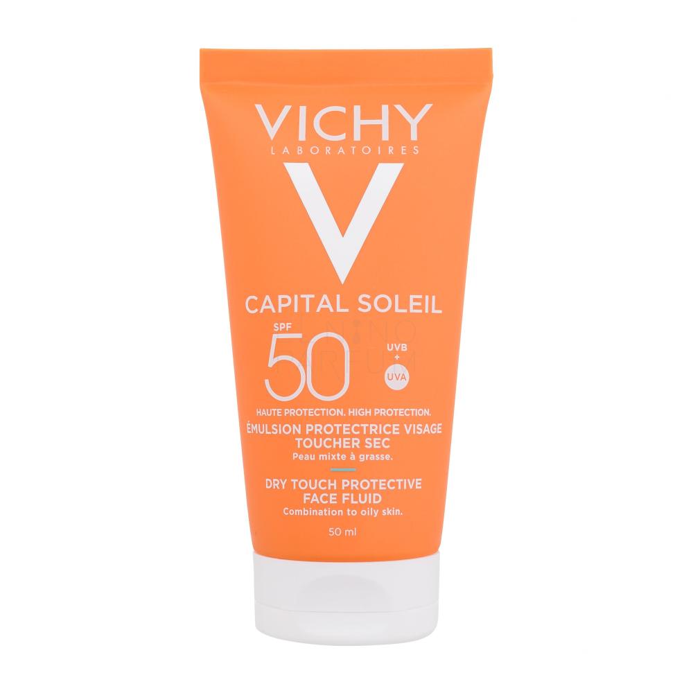 Zapewnij swojej skórze niezbędną ochronę przed szkodliwym wpływem słońca z wodoodpornym fluidem Vichy Capital Soleil Dry Touch Protective Face Fluid SPF50. Jego formuła zapobiega krótkotrwałym i długotrwałym uszkodzeniom cery, które powodują promienie UV. Dzięki zawartości wody termalnej Vichy kosmetyk wzmacnia właściwości obronne skóry i pozostawia ją jedwabiście gładką, lekko matową i świeżą.